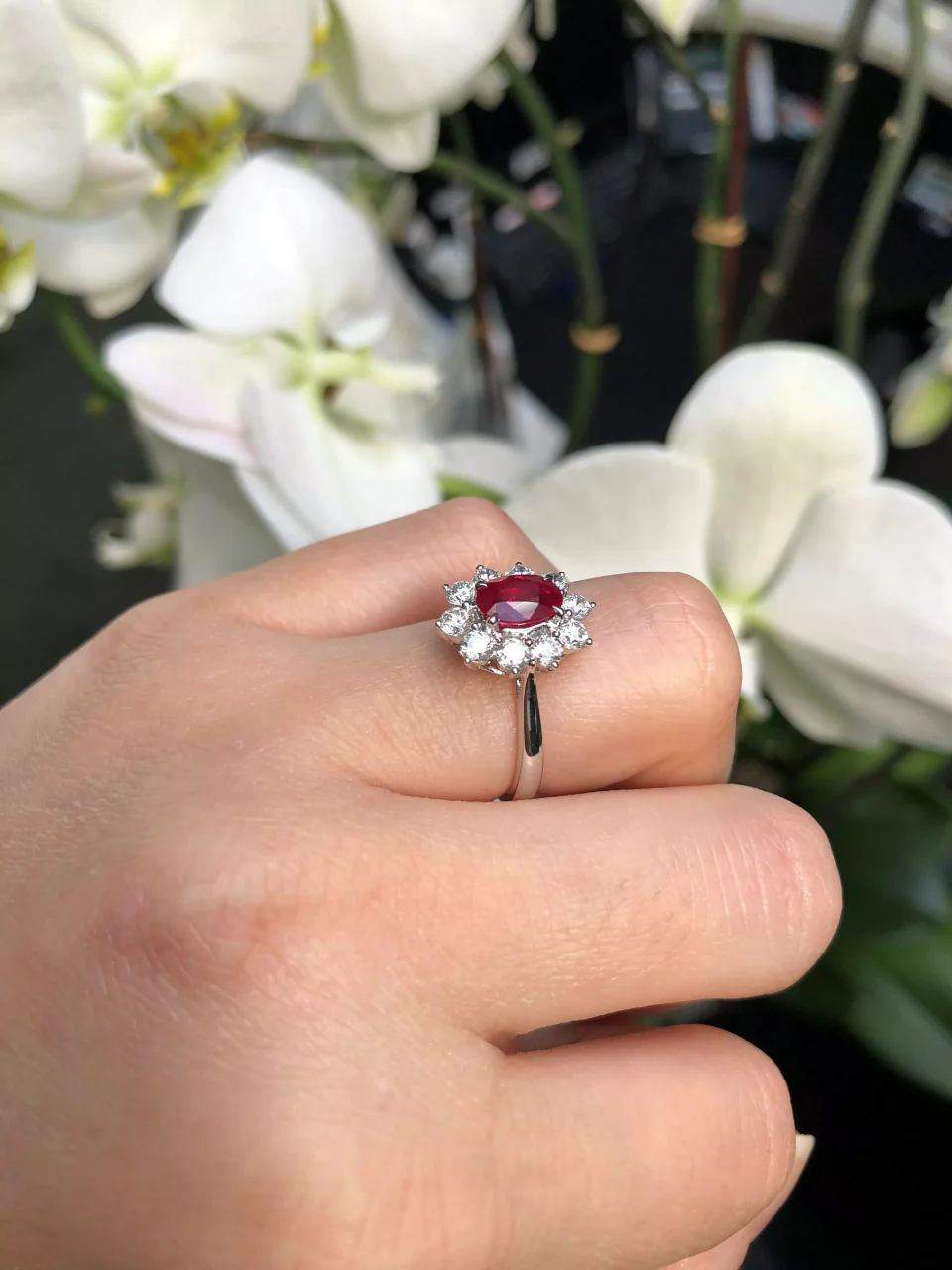 18ct white gold 1.02ct oval cut ruby and round brilliant cut diamond halo ring. D10=0.96ct