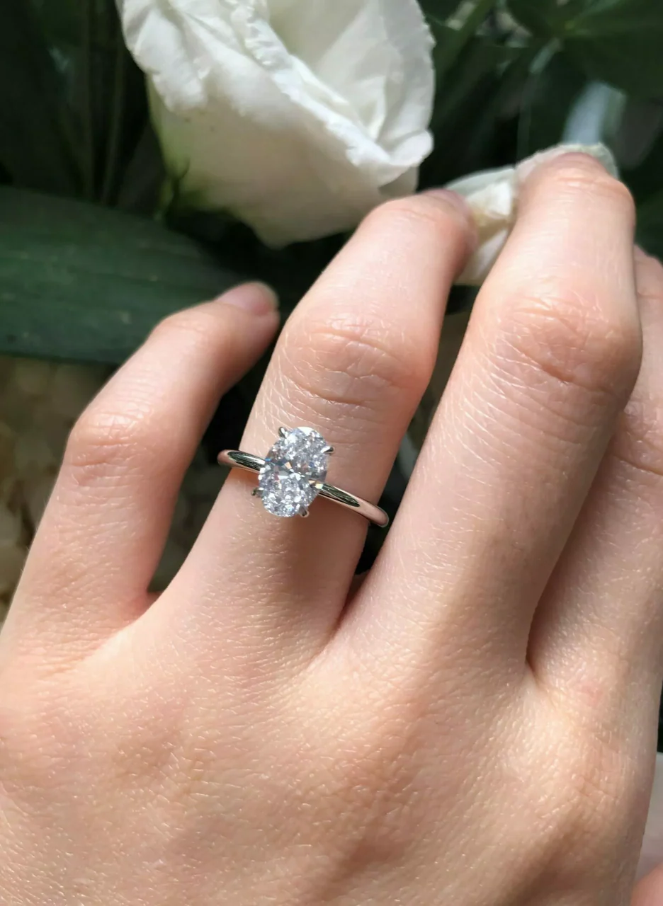 18ct white gold oval diamond hidden halo ring featuring 2.01ct F